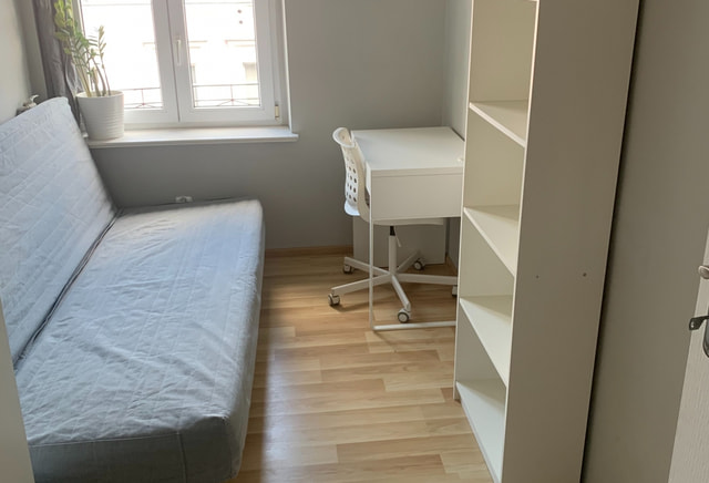 Pokój ok. 10 m², z rozkładaną sofą, biurkiem, krzesłem, dużą szafą z relingiem i półkami oraz regałem – wszystko funkcjonalne i gotowe do zamieszkania.